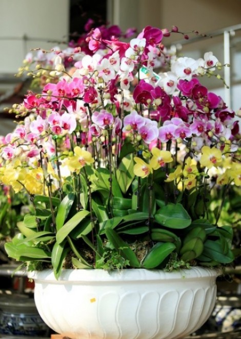 Chậu lan hồ điệp trên được thiết kế ghép chậu với số lượng cây hoa lan hồ điệp nhiều màu