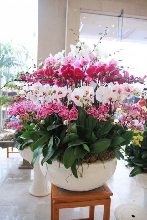 Chậu lan hồ điệp trên được thiết kế ghép chậu với số lượng cây hoa lan hồ điệp nhiều màu