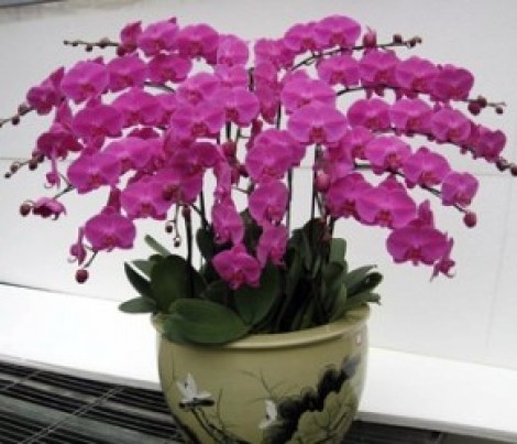 Chậu lan hồ điệp trên được thiết kế ghép chậu với số lượng cây hoa lan hồ điệp màu tím.