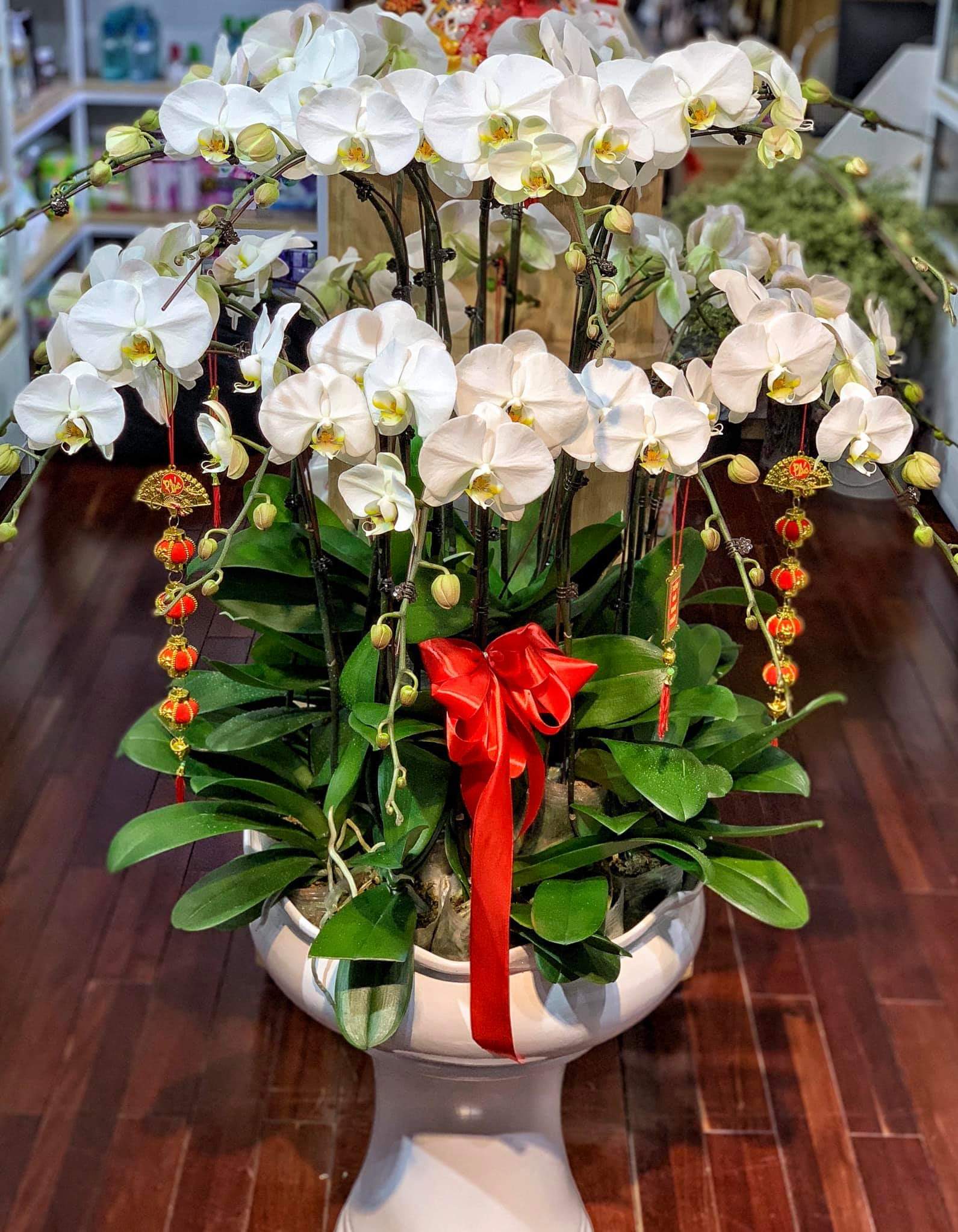 Chậu hoa lan hồ điệp được ghép bởi 20 cây lan hồ điệp màu trắng