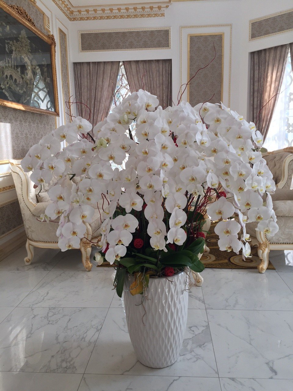 Chậu hoa lan hồ điệp được ghép bởi 20 cây lan hồ điệp màu trắng