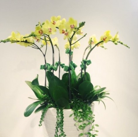 Chậu lan hồ điệp trên được thiết kế ghép chậu với số lượng cây hoa lan hồ điệp màu vàng.