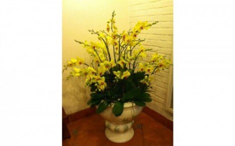 Chậu lan hồ điệp trên được thiết kế ghép chậu với số lượng cây hoa lan hồ điệp màu vàng.