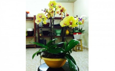 Chậu lan hồ điệp trên được thiết kế ghép chậu với số lượng cây hoa lan hồ điệp màu vàng.
